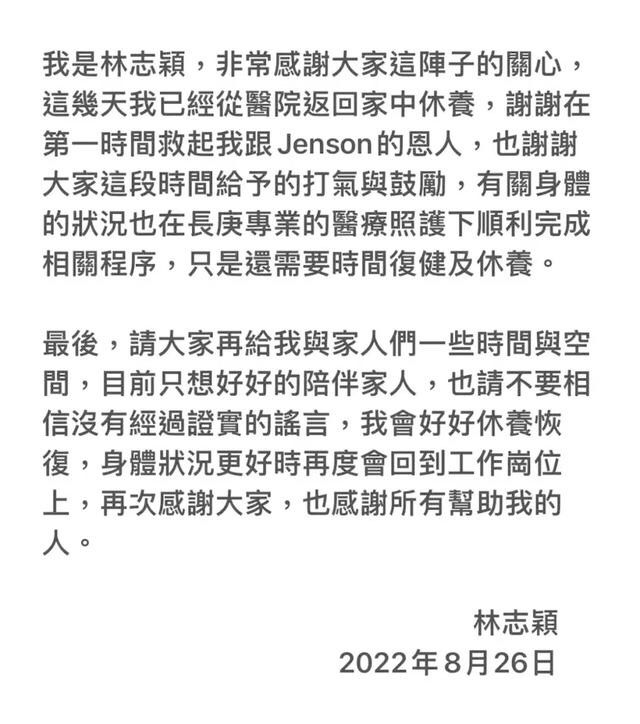 自从林志颖经历车祸后,妻子陈若仪就很少在社交平台更新动态,只偶尔向大家报平安,这可以看出她在悉心地照料林志颖。
