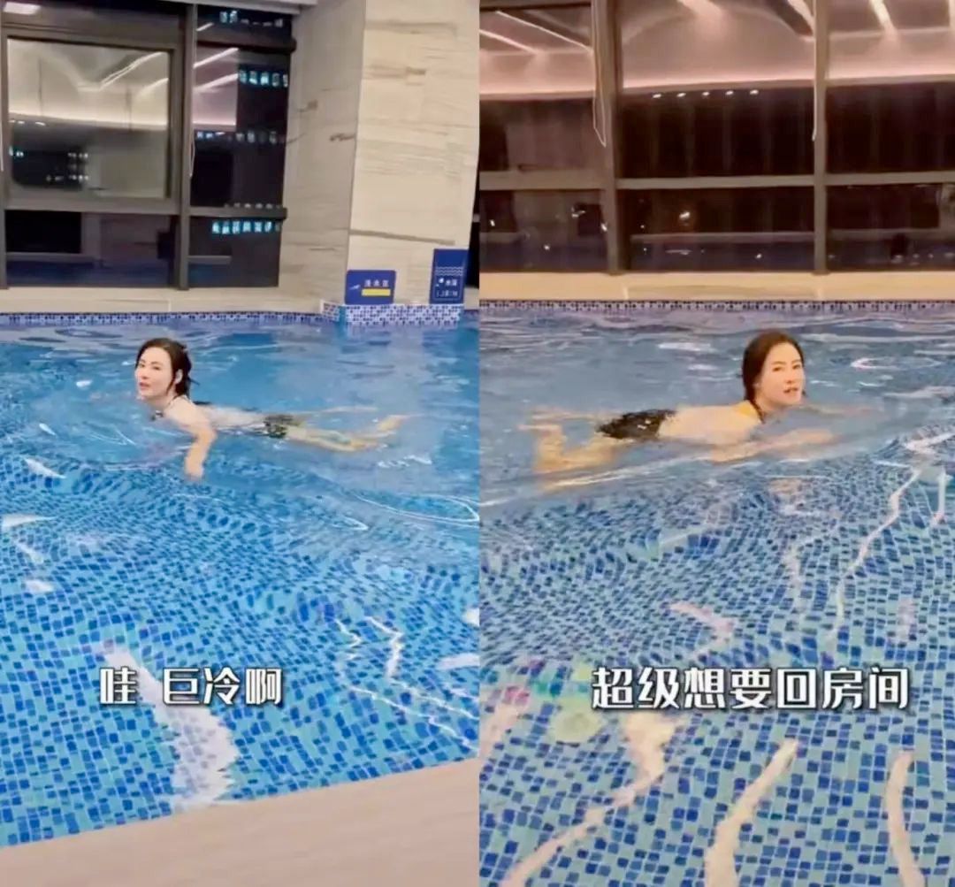 张柏芝边游泳还边对着镜头说话,表示刚下水的时候水里很冷,她甚至冷得都要回房间了,但是坚持了一会她就习惯了。