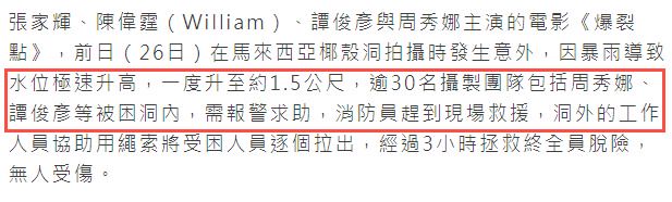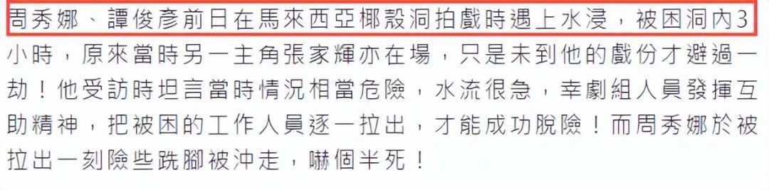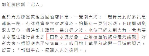 据悉,周秀娜前几天跟随剧组《爆裂点》前往马来西亚拍戏,当时他们在一个山洞附近,没想到突然下起了大暴雨,河里的水位迅速升高。