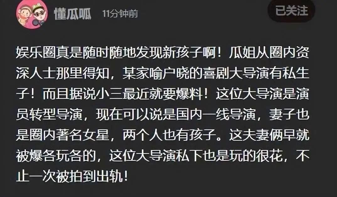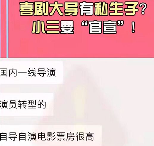 这不,娱乐圈又有新动静了。今天有知名娱记称自己从圈内资深人士那里已经获取到劲爆消息,称圈内的某位知名导演有私生子。