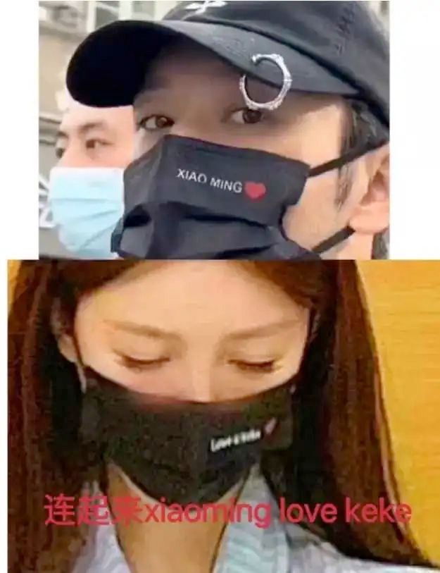 而且两人还疑似有情侣定制口罩。黄晓明被拍到他戴的口罩上印着“XIAO MING”后面带着一颗红心,叶柯同样款式的口罩同一位置印着“LOVE KEKE”而且后面也有一颗红心,连起来就是“XIAO MING LOVE KEKE”。