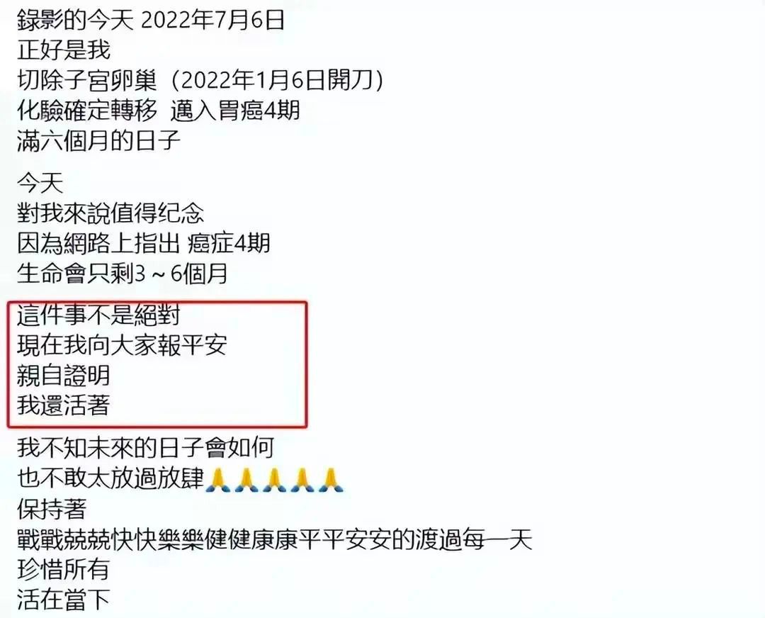 不仅如此,唐玲还在社交平台透露自己的胃癌已经到了晚期,网络上说辞是寿命不到半年。但现如今唐玲还活着,她会健健康康地度过每一天。
