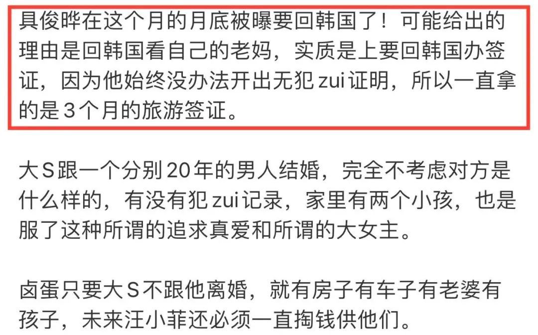 舆论发酵后,还有媒体爆料称具俊晔12月底就要回韩国了,因为他拿不出无犯罪证明,所以不能在中国台湾定居,目前一直是靠旅游签证才能住在大S家里。