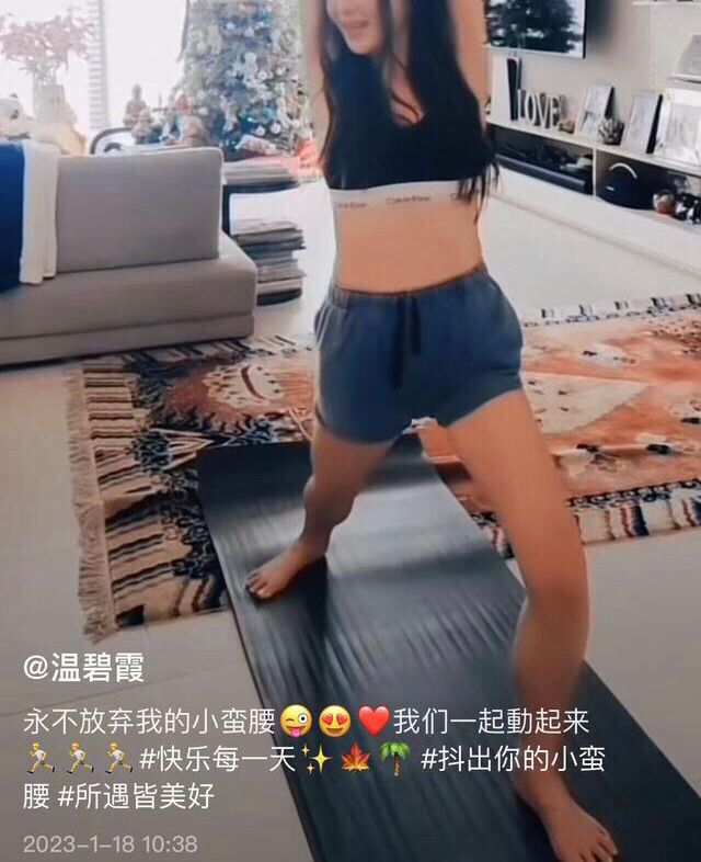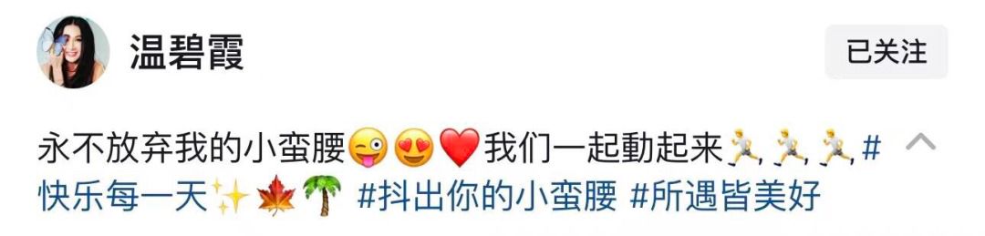 配文里,她还开心地写道:“永不放弃我的小蛮腰,我们一起动起来。”