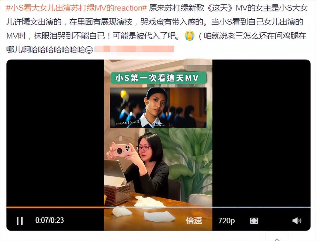 小S随后又晒出了自己观看女儿MV的视频,视频中的她穿着简单,打扮朴素戴着眼镜,似乎是素颜出镜。她手里拿着手机正在看,眼睛鼻子都哭红了,看起来非常感动,也很喜欢女儿的表演。