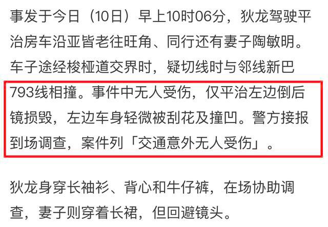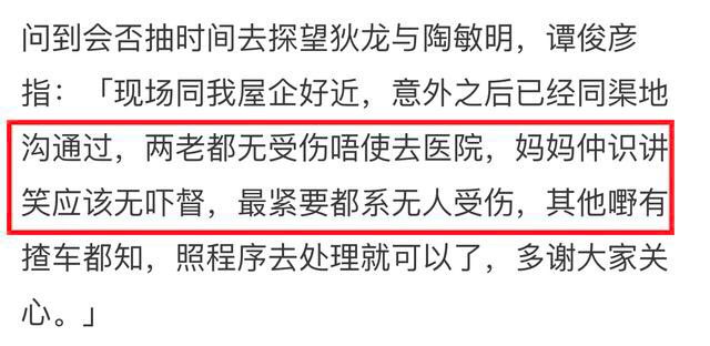 从现场图来看,狄龙没有明显的外伤,他一直很淡定。事后,记者采访他的儿子谭俊彦,对方表示父母都没有受伤,甚至没去医院检查,只是妈妈被吓到了,平复下心情就好了。