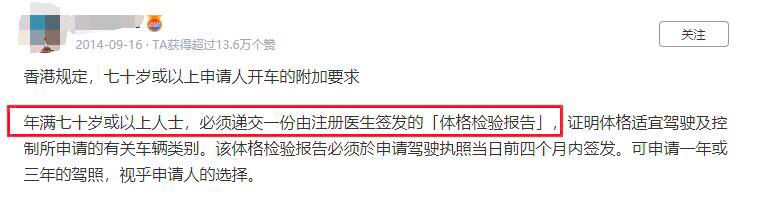 在香港,没有明确规定老年人不能开车上路,但70岁以上的人若是想开车,必须提供一份体检合格的报告,才能驾车上路。