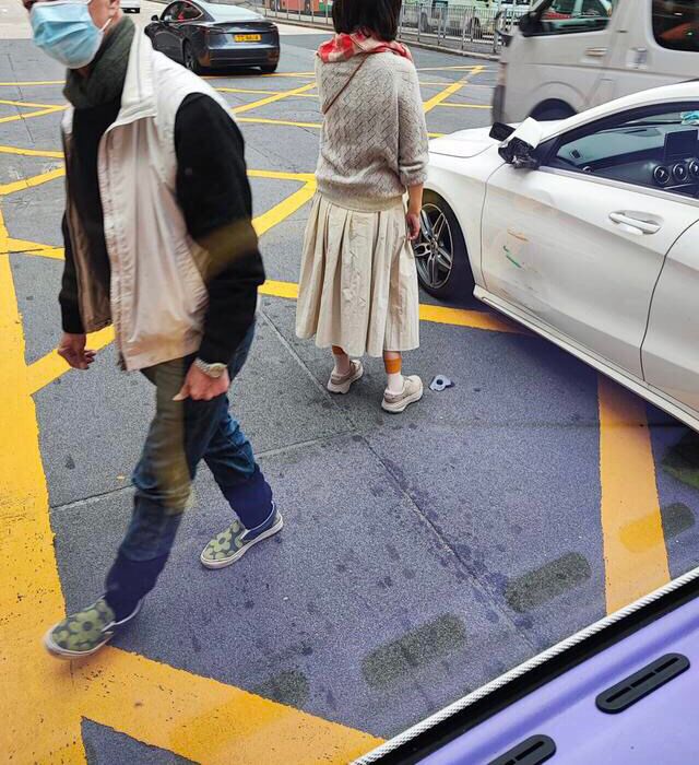 发生车祸后,狄龙和妻子下车配合交警调查,他穿着黑色毛衣搭配马甲外套,打扮得很显年轻。狄龙稍微有点驼背,但整体状态非常好,看起来就像是五十几岁的人一样。67岁的陶敏明穿着裙子,四肢纤细,夫妻俩的身体都很硬朗。