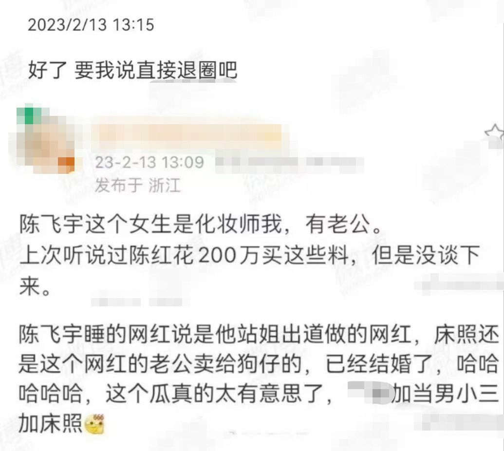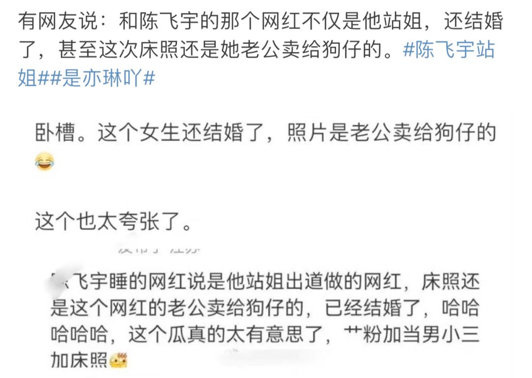 更有爆料称,这个站姐是已婚的,被老公发现后,陈飞宇妈妈陈红愿意花200万买下来,不过最后似乎是没有谈拢,被站姐老公卖给狗仔,这个瓜还是被狗仔放出来了。这样说起来的话,陈飞宇似乎是和已婚粉丝从2017年开始熟知了,认识了6年,并日久生情,做了男小三,实在是令网友十分震惊。