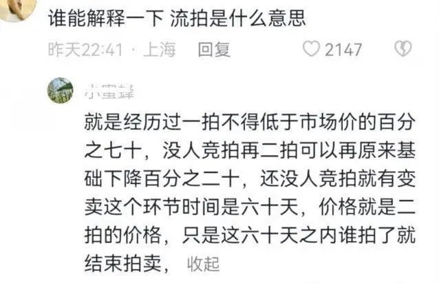 这里解释一下什么叫流拍,就是经历过一拍不得低于市场价的百分之七十,没人竞拍再二拍,此时的价格在原来的基础下降百分之二十。如果还没人竞拍就变卖,这个环节是60天,价格是二拍的价格,60天内谁拍了就结束拍卖。