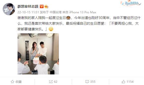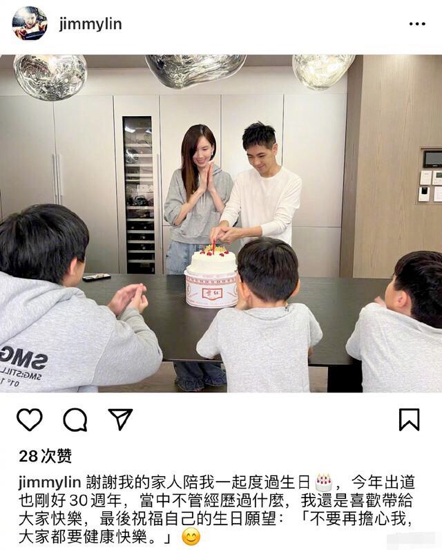 当天林志颖在个人社交平台上发文表示,非常感谢家人为自己庆生,同时今年也刚好是自己出道30周年了,在这30年里,他经历了很多东西,但不管怎样,他最喜欢并坚持的事情就是给大家带来快乐,并希望大家不用担心自己了,自己的身体已经恢复良好。