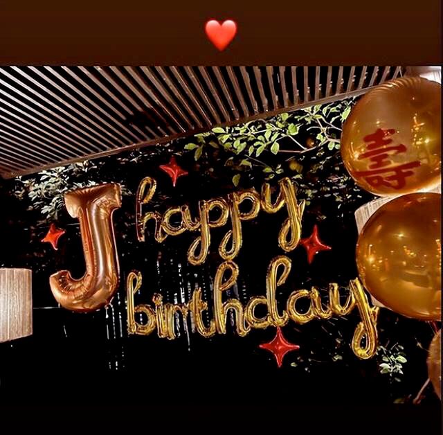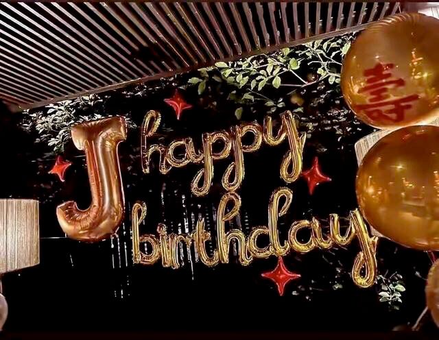 画面中,他们仅用气球进行了简单地装饰,墙上中央是英文的生日快乐,最右边挂着几个金色气球,上面印着“寿”这个字,可谓是很朴实低调了。