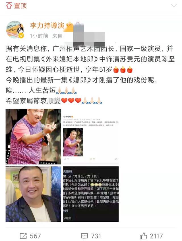 随后,《喜剧之王》《食神》的副导演李力持也置顶了一条动态,称陈坚雄疑因心梗去世,消息一出引起无数观众震惊。