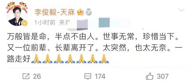 《外来媳妇本地郎》中康天麻的饰演者李俊毅也发文悼念,感慨命数无常,更应该珍惜当下。