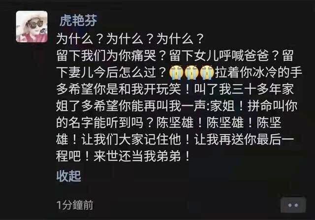 在私人社交平台,《外来媳妇本地郎》中“二嫂”的扮演者虎艳芬发文表示哀悼,她激动地连打出了几个“为什么”,还悲痛地表示多希望陈坚雄再叫她一声家姐,称希望陈坚雄来世还当她的弟弟。