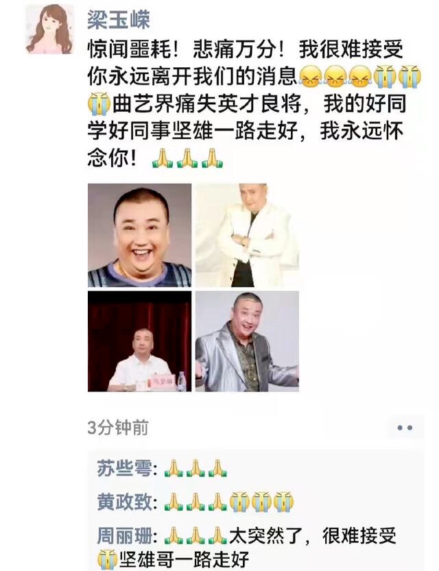 剧里陈坚雄的同学同事、知名粤曲演唱家梁玉嵘也发文证实了这一消息,并表示陈坚雄的去世是曲艺界的损失,字里行间都是对陈坚雄的不舍与怀念。