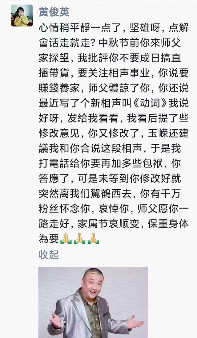 虽说心梗这种事情很难防范,但病发一定有原因,陈坚雄的相声师父在朋友圈发文,解释了陈坚雄突发心梗的原因就是太操劳。师父黄俊英表示中秋节之前陈坚雄还来看望自己,当时就批评他不要成天搞直播带货,要关注相声事业,但陈坚雄说自己要赚钱养家,为师只好原谅。陈坚雄还说自己写了个新相声,没想到竟是绝唱。