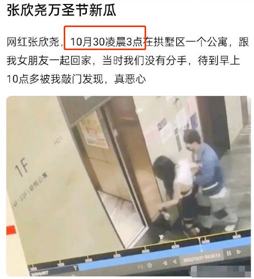 根据监控画面和爆料网友的描述,事件发生在10月31日万圣节凌晨3点,其女友跟张欣尧姿势亲密,共同挽手走进电梯,之后也结伴一起走进了房间,直到当天10点网友去敲门才发现事情不对劲。