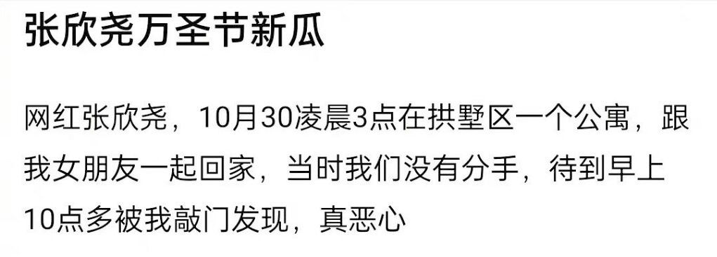 第二天早上,网友敲门进去捉奸刚好和张欣尧正面相遇,随即拍下张欣尧的照片发到了社交平台上,这才确定张欣尧做了两人感情的小三。