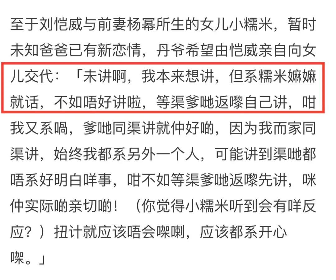 刘丹似乎也考虑到这一点,他本来很想告诉孙女,可是老婆李馥莹制止了他。两位老人在家商量后达成一致,觉得这件事还是应该由刘恺威回港后亲自跟女儿说,而不是爷爷奶奶提前透露。