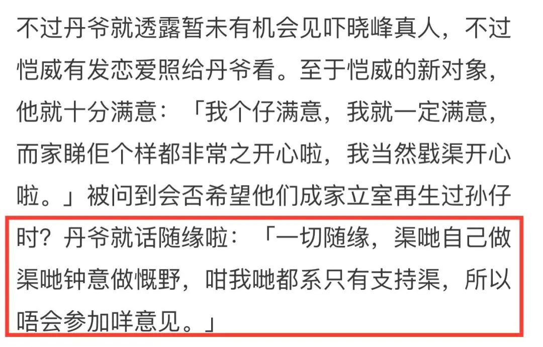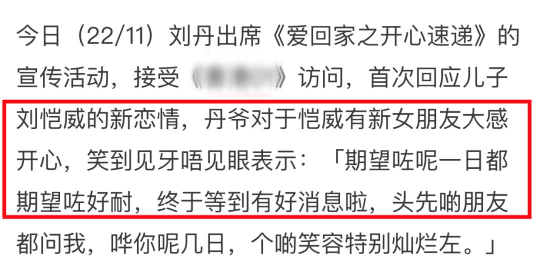 父母都希望孩子们能过得幸福,刘恺威离婚四年才官宣了新恋情,刘丹自然是感到无比开心。刘恺威私下经常与爸爸分享自己的恋爱日常,也会把李晓峰的照片发给亲人看,家族里的人对他的新女友都很满意。