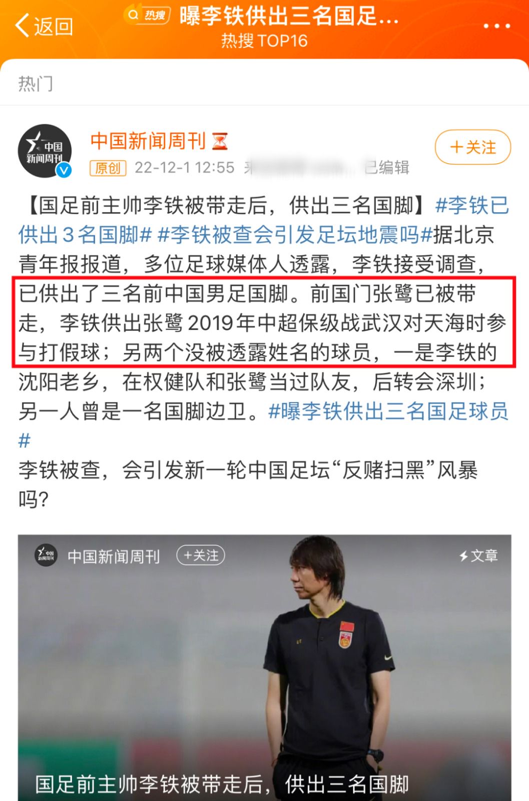 国足内部贪污腐败之风盛行,有这样的教练,如何能带出优秀的球员?官媒中国新闻周刊于12月1日发文,爆料李铁接受调查期间,供出了三名前国足队员,其中一位就是守门员张鹭。