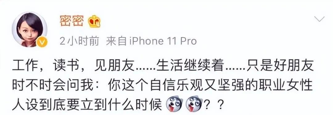我们只能看到一个显而易见的现象,陈密结婚后越发低调了,一开始还会偶尔跟网友们分享个人生活,到后来干脆一言不发。这种沉默可不是一个沉迷于幸福婚姻的女人的沉默,而是一个女人对家庭生活失望透顶后的沉默。