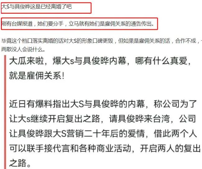 同时也说明,具俊晔在韩国绝对是有问题的。与此同时,他与大S的婚姻也被曝出根本没有真爱深情一说,一切不过是演戏为了钱。有爆料称大S与具俊晔是达成协议的,两人是合约关系,一起赚来的钱还要按比例分成。可以说具俊晔是大S找来的员工,一起在大众面前演戏捞金的。
