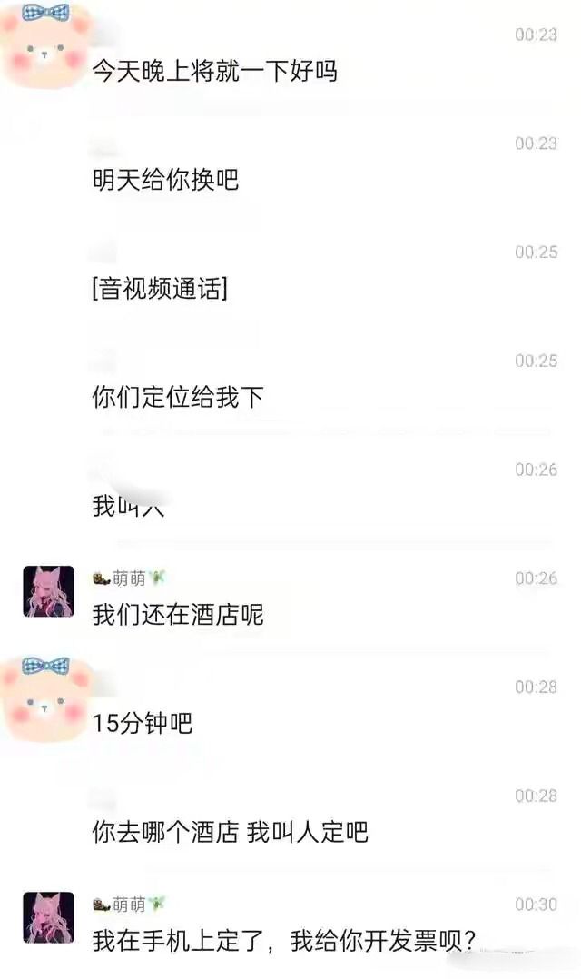 紧接着从放出聊天记录可以发现,毕滢因为不满意直播公司没有提供有套房的酒店而表示不住了,并要求对接人退掉酒店并重新订有套房的酒店。哪怕直播公司对接人给张丹峰和毕滢安排了附近最好的酒店。在商量无果的情况下,毕滢直接果断的订了有套房的酒店,称给对方发票报销。