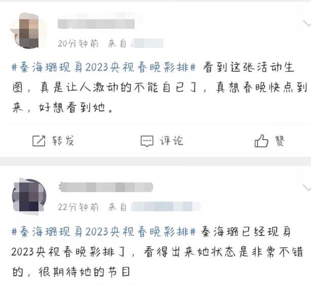 秦海璐的粉丝看到路透图也十分激动,表示:“看到这张活动生图,真是让人激动的不能自已了,真想春晚快点到来,好想看到她”,“我最喜欢的秦海璐难道要上今年春晚?一直都很喜欢她,而且作为春晚常客今年要展示什么拿手好戏呢”,看来粉丝也是非常期待秦海璐的表演了。