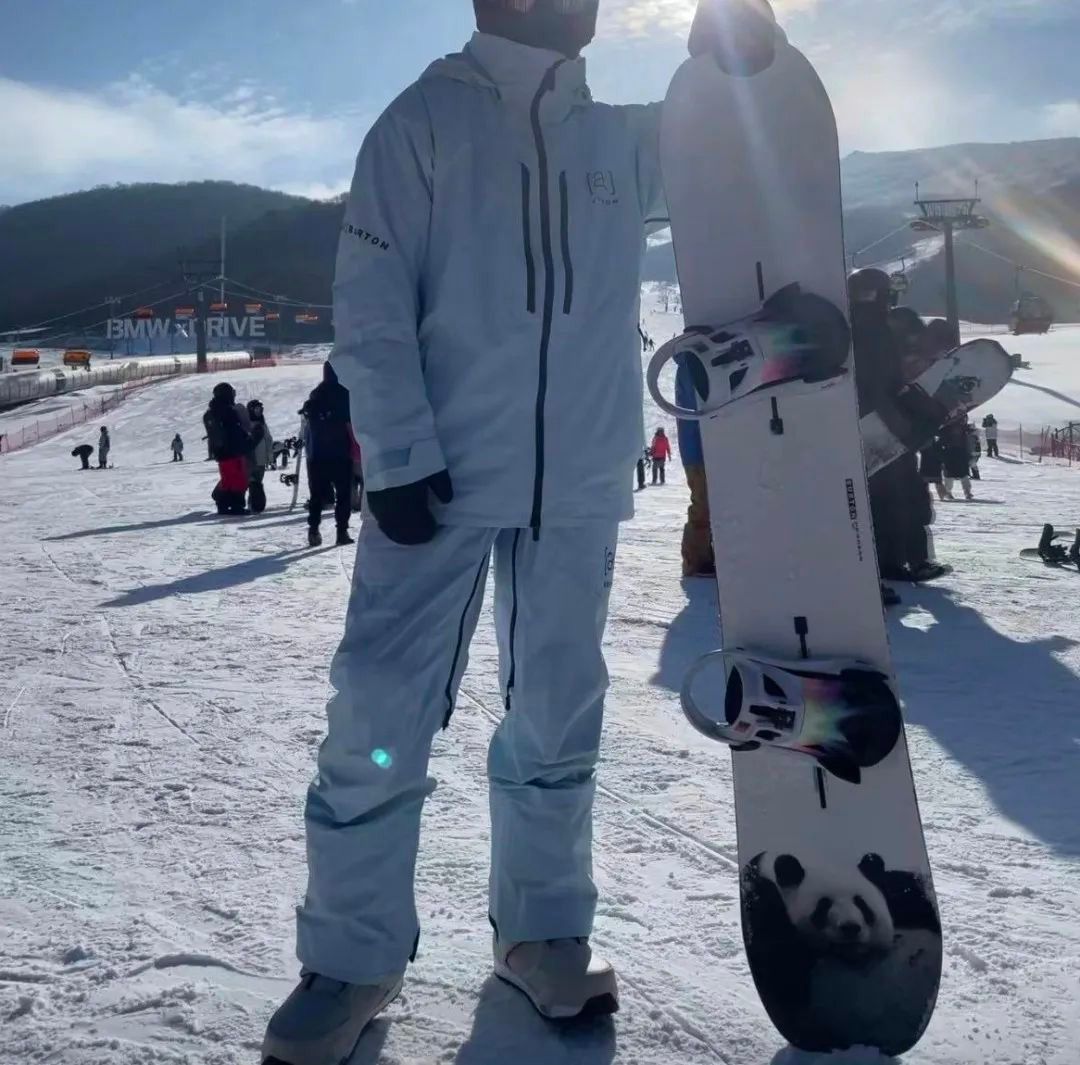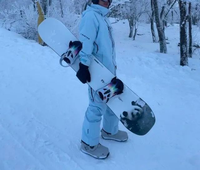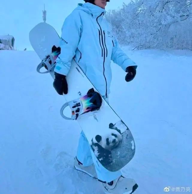 贾乃亮一身白色的滑雪服展示出了他帅气的模样,而且滑雪板也是“国宝”熊猫的图样,在皑皑白雪当中也格外的抢眼了。