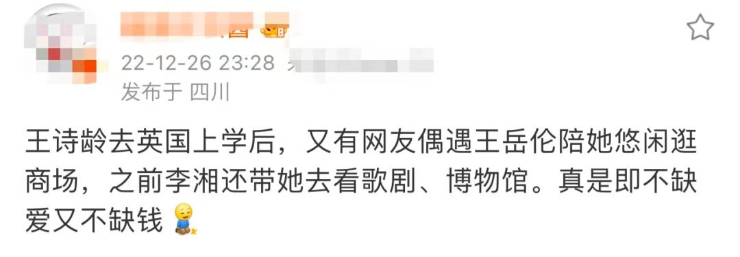 不过,让人意外的是,此次王诗龄的身旁并没有李湘的身影。据悉,王诗龄前往英国读书后,李湘便放弃了国内的工作,一同来到伦敦做陪读。有网友表示,曾经在伦敦的街头偶遇过王诗龄与李湘一同逛街,并拍了一张他们的背影图。不知道此次是因为王岳伦在一旁有意避讳,还是有其他什么原因。