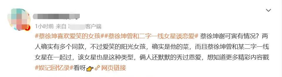 12月29日,娱乐圈再次迎来恋情大瓜,有狗仔爆料顶流男星蔡徐坤恋情瓜,消息一出,引发全网轰动,吃瓜群众纷纷加入讨论大军,猜测女方到底何许人也。熟悉蔡徐坤的都知道,此前他便和谢可寅传出过恋情,这次八卦媒体又爆出他与一位名字为两个字的一线女明星曾有过一段恋情,此消息一下子便登上了热搜,引来无数网友的热议。