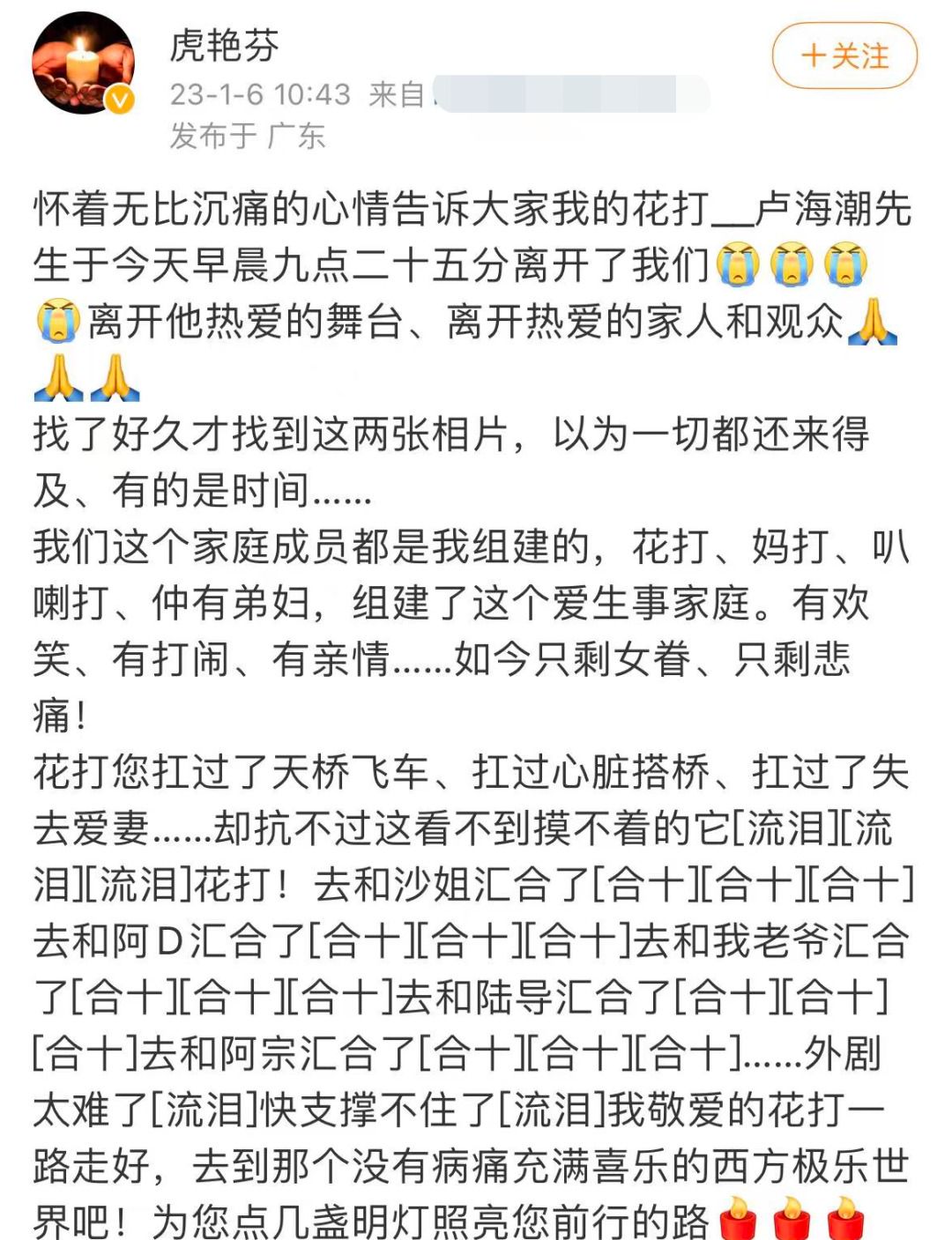 《外来媳妇本地郎》当中的“二嫂”苏妙婵的扮演者虎艳芬悲痛发文证实了老先生去世的消息。她在文中表示卢海潮扛过了心脏搭桥,扛过了失去爱妻的痛苦,却没有扛过这次的劫难。