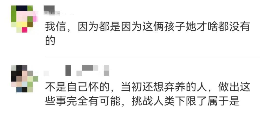 也有人表示:我信,因为都是因为这俩孩子她才啥都没有的。不是自己怀的,当初还想弃养的人,做出这些事完全有可能,挑战人类下限了属于是!