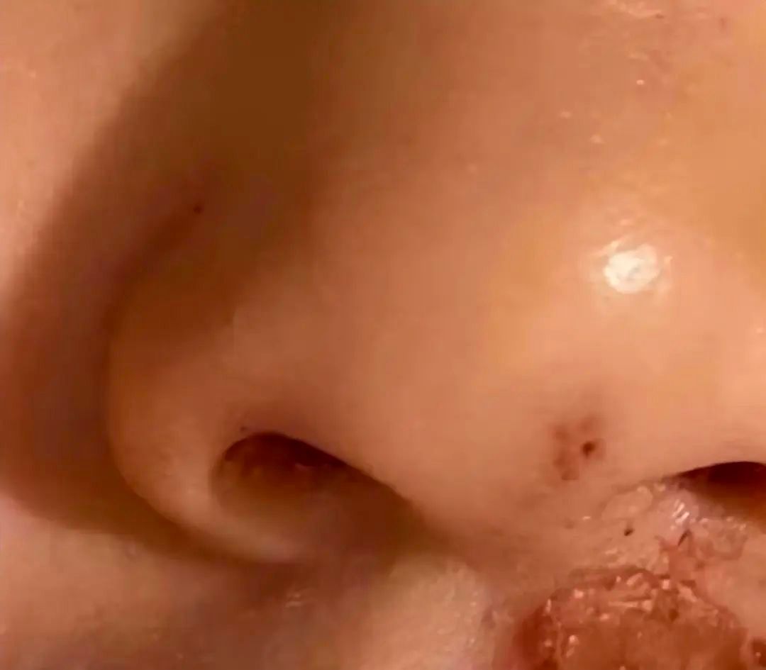照片中的男孩,鼻子处出现类似烟疤状的伤痕。