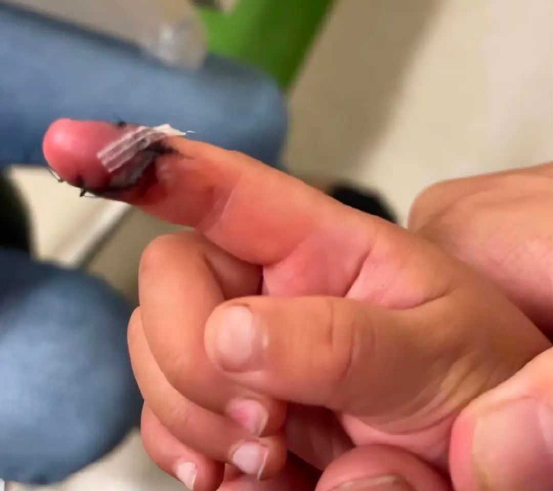 照片中,女孩的一根手指有一个缝针的伤口,张恒表示医院诊断报告上有证明这是一个长达6厘米的伤口,缝了5针,伤口情况相当严重,伤痕看起来绕了手指一圈,伤口很深,血迹发黑。