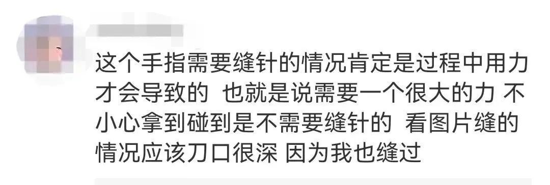 还有人认为:这个手指需要缝针的情况肯定是过程中用力才会导致的 也就是说需要一个很大的力 不小心拿到碰到是不需要缝针的 看图片缝的情况应该刀口很深,因为我也缝过!