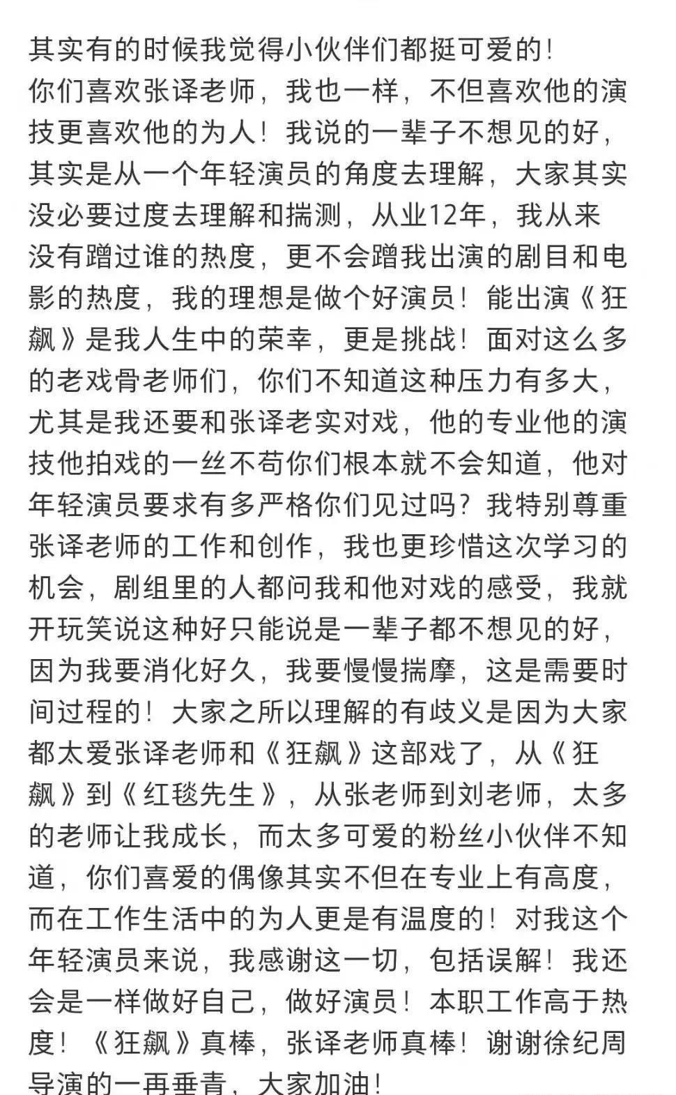 随后,她在其他账号上发了一篇小作文,回应了大家的质疑。第一句话:其实有的时候我觉得小伙伴们都挺可爱的!她说自己也喜欢张译老师,不仅喜欢他的演技,更喜欢他的为人,她解释自己说的“一辈子不想见的好”,是从一个年轻演员的角度去理解。