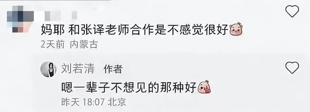 然而当剧粉在刘若清账号的评论中留言,询问对方与前辈张译合作的感觉是不是特别好时,刘若清竟然用古怪的语气表示“嗯,一辈子不想见的那种好”。