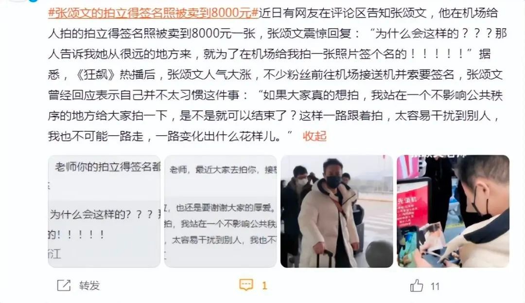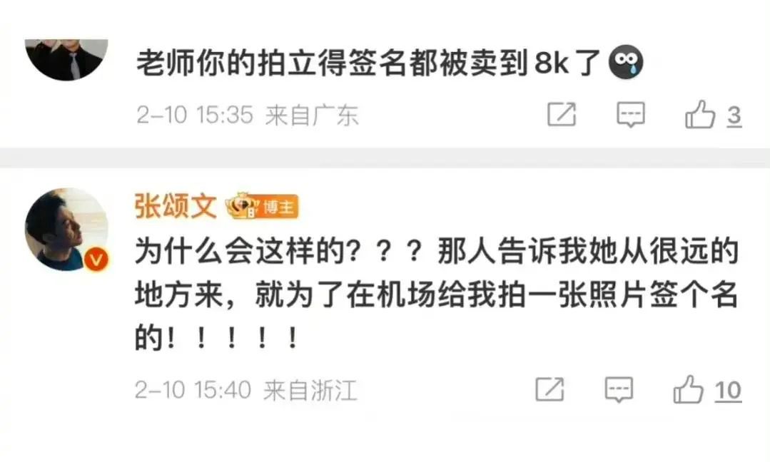 但是令人没想到的是,这个签名照有网友在张颂文的社交动态下评论称,已经被转手卖掉了,而且卖了8000块,张颂文也是表示非常震惊,直言为何会这个样子,还称当时让他签名的人称自己从很远的地方来的,就是为了在机场给他拍照要一张签名。