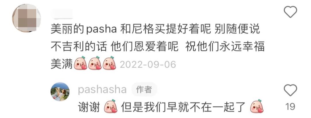 这些年,时不时传出二人已离婚的消息,网友也扒出一些蛛丝马迹,直指二人感情破裂。面对网络舆论,帕夏其实早已公开回应。在2022年9月,二人的婚姻再度引起争议,有网友在评论区发表了对她们婚姻的祝福。