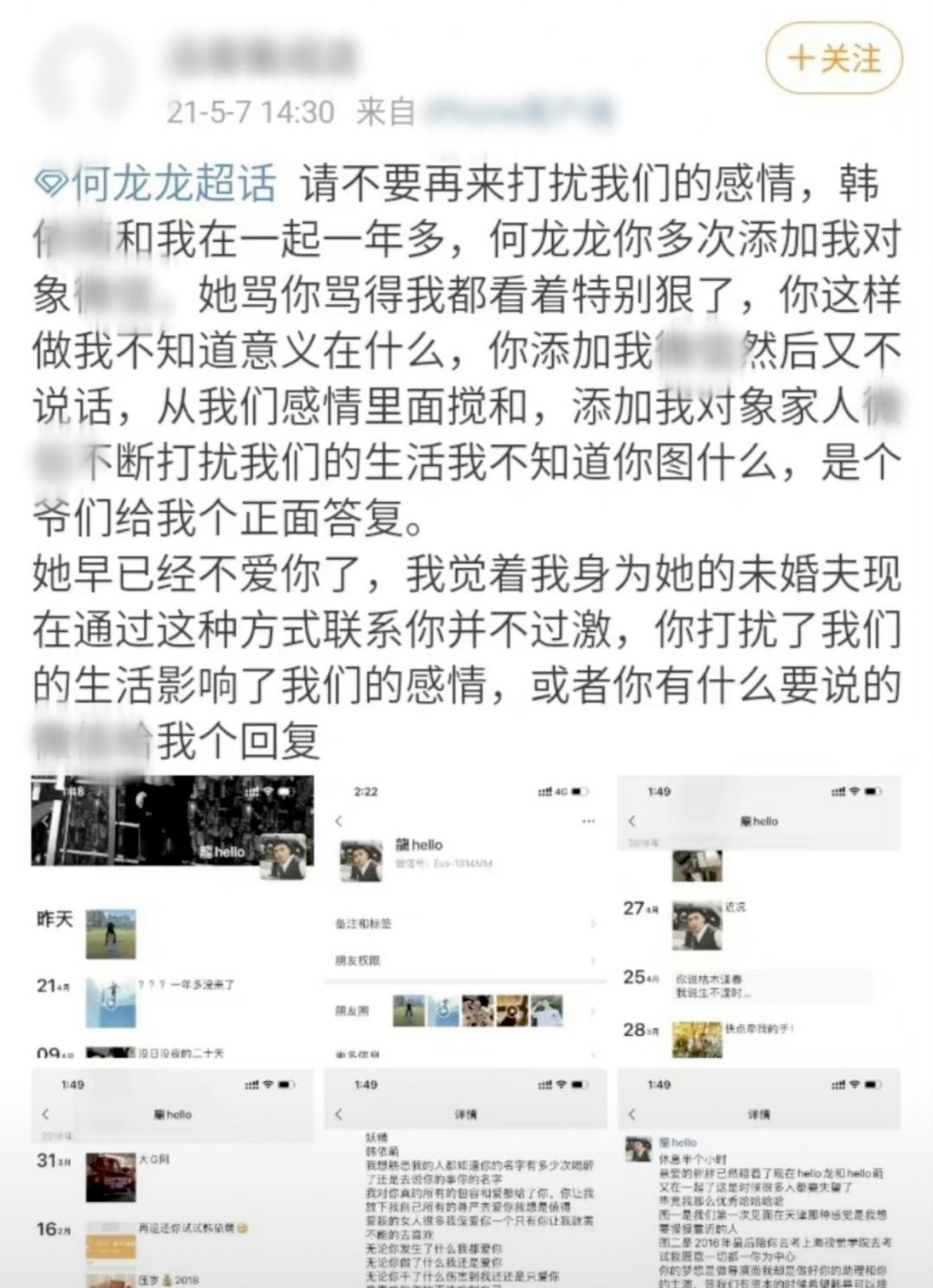 还有一位知情人士爆料,何龙龙这些年一直在骚扰他的未婚妻,多次插足他们的感情,私生活极其不检点。